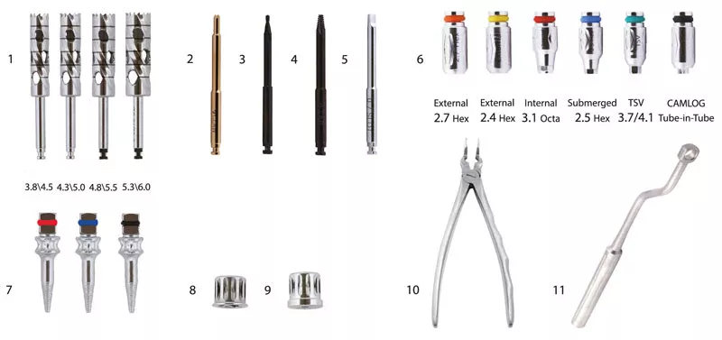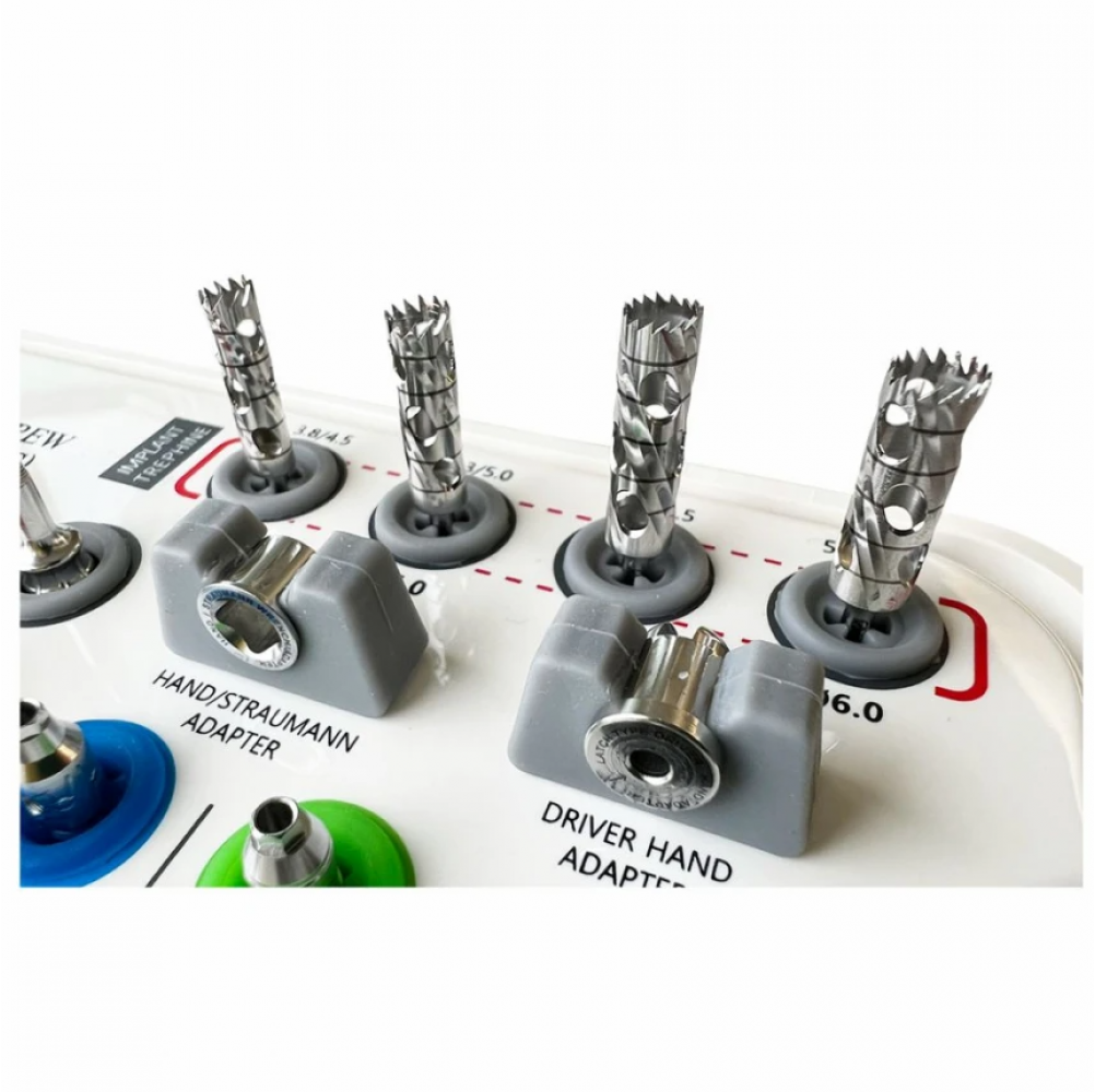 - Трепани кісткові - використовуються для видалення імплантату з кістки. В комплекті трепани розміром 3.8/4.5, 4.3/5.0, 4.8/5.5, 5.3/6.0 (внутрішній діаметр трепану/зовнішній діаметр).